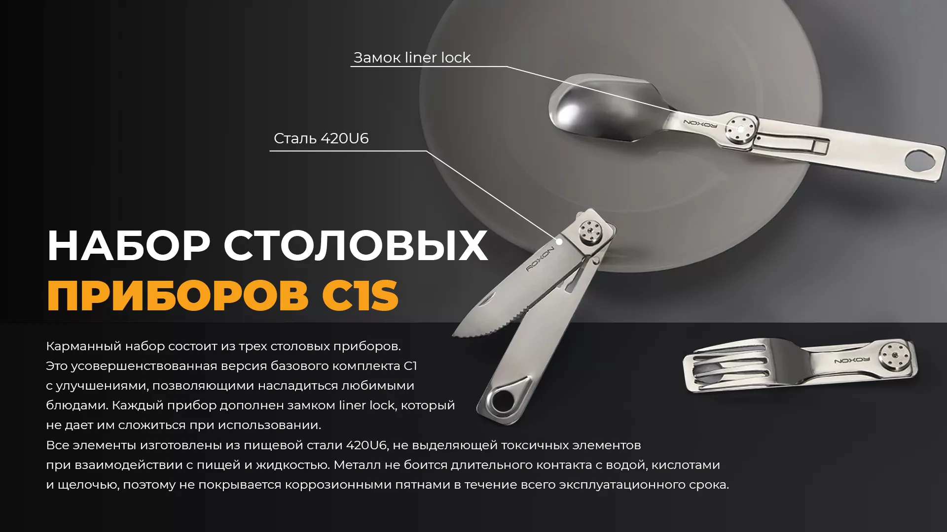 Карманный набор Roxon C1S включает три столовых прибора: ложку, вилку и нож, позволяя с комфортом насладиться любимыми блюдами даже вдалеке от дома. Это усовершенствованная версия базового комплекта C1 с изменениями в виде увеличенной глубины ложки и ширины вилки, а также наличия замка liner lock, который присутствует в каждом столовом приборе, не давая им сложиться во время использования.