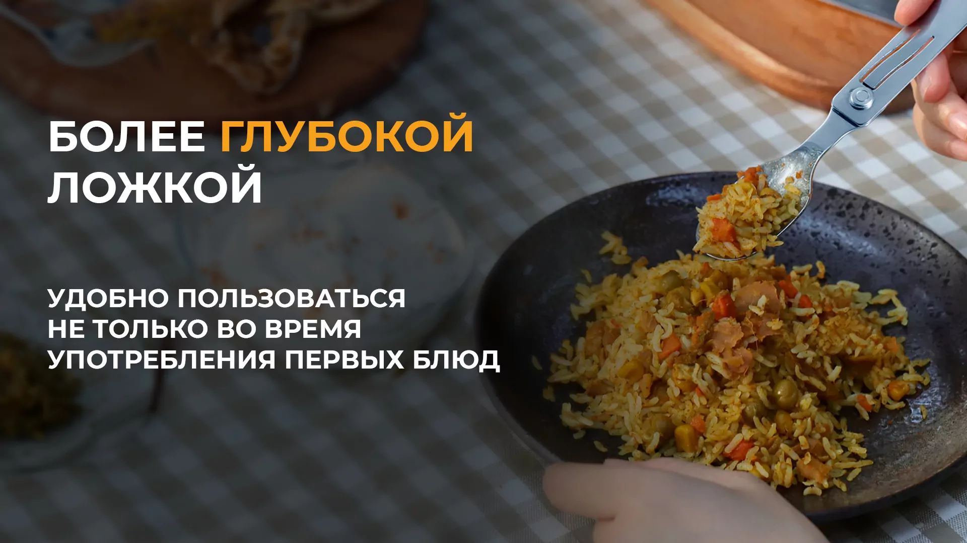 Ложка имеет закругленные края, как и зубчики вилки, сводя к нулю риск случайного повреждения ротовой полости во время принятия пищи. Комбинированная заточка ножа расширяет его возможности: часть с прямым лезвием позволяет аккуратно нарезать овощи и фрукты, а серрейторная режущая кромка эффективно справляется с резом мясных волокон.